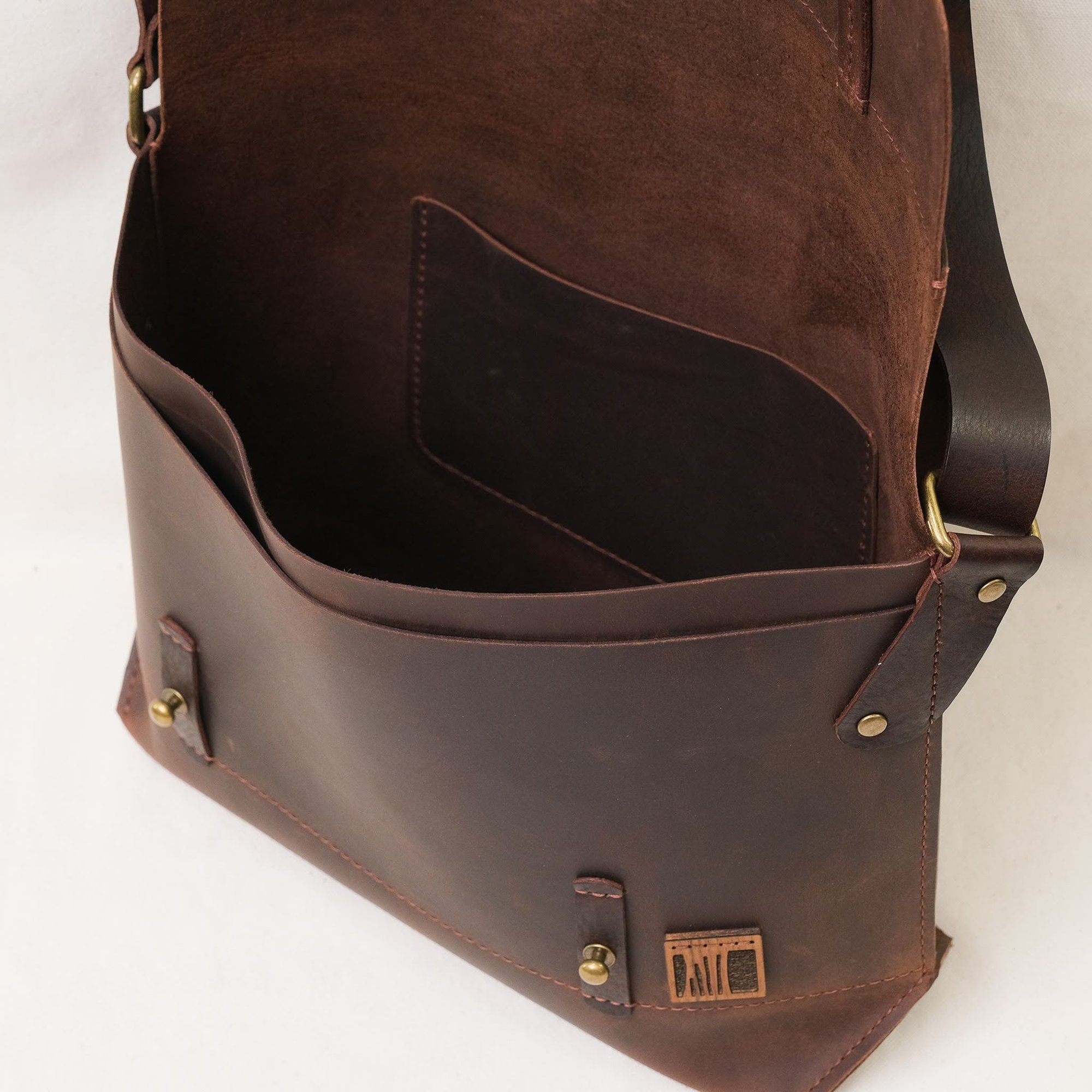 body - vintage dark reddish brown leather with a smooth and semi-polished finish