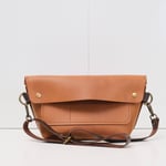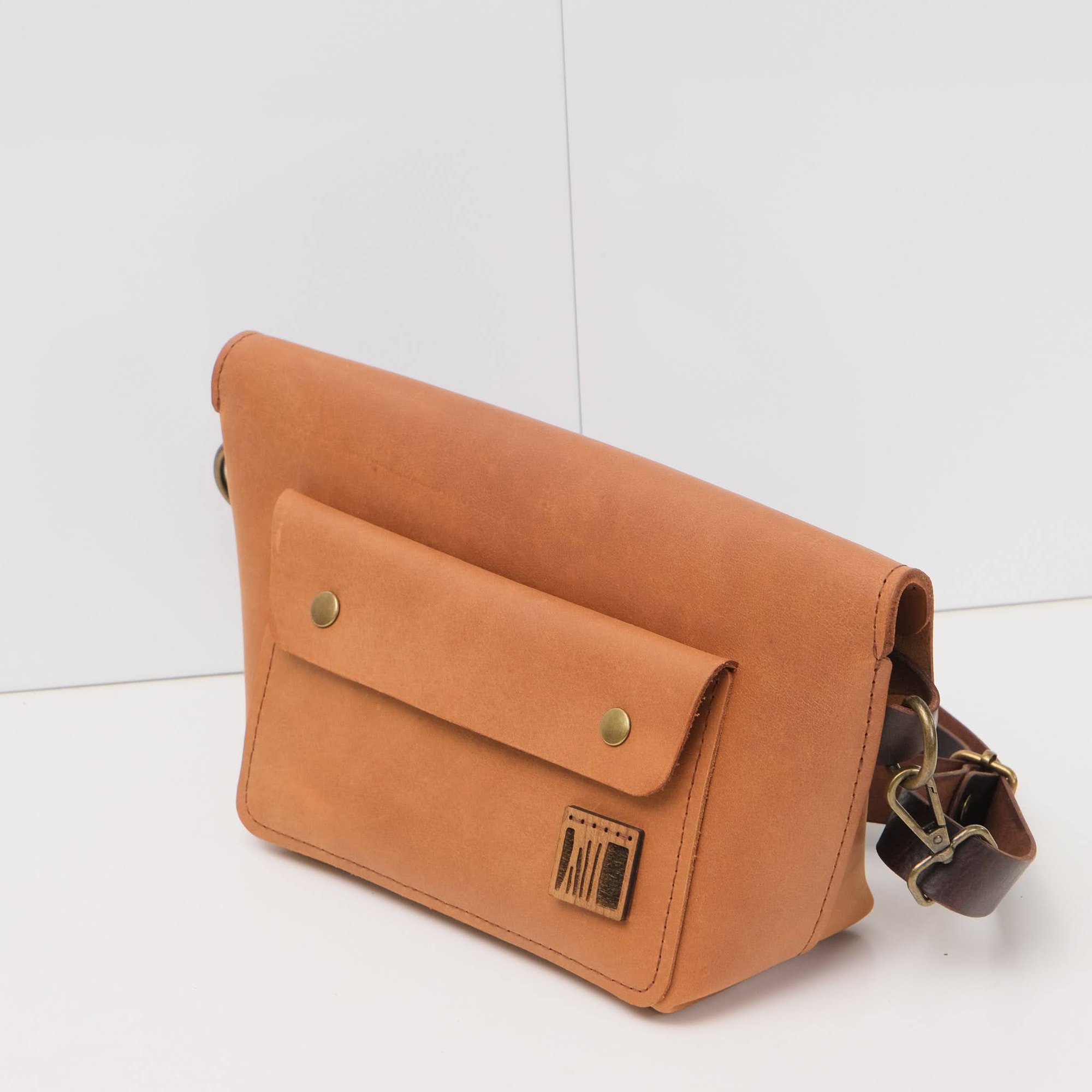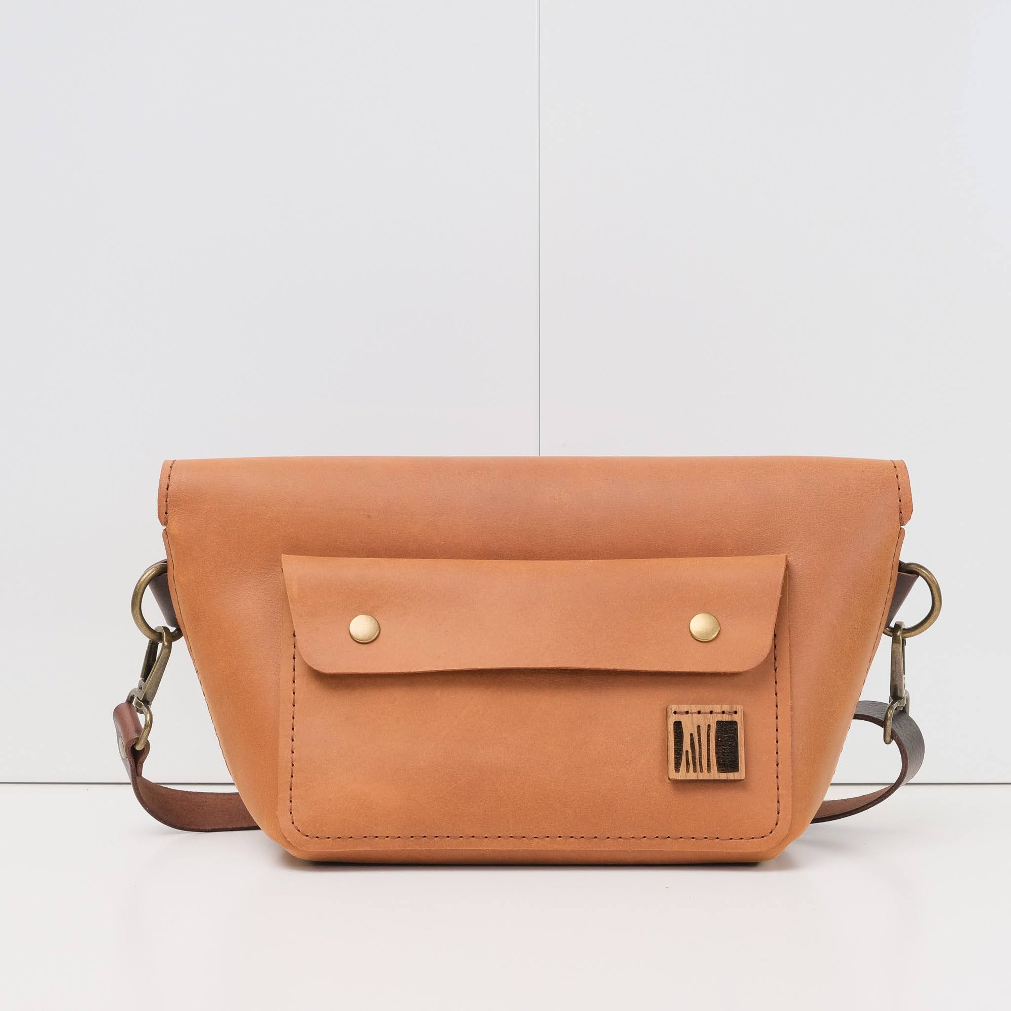 This comes with a front pocket with snaps and a 2-slot back pocket. Strap is adjustable.