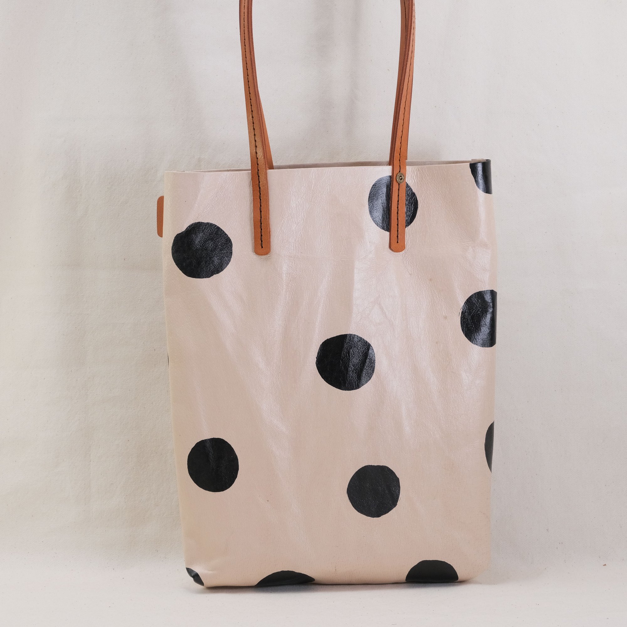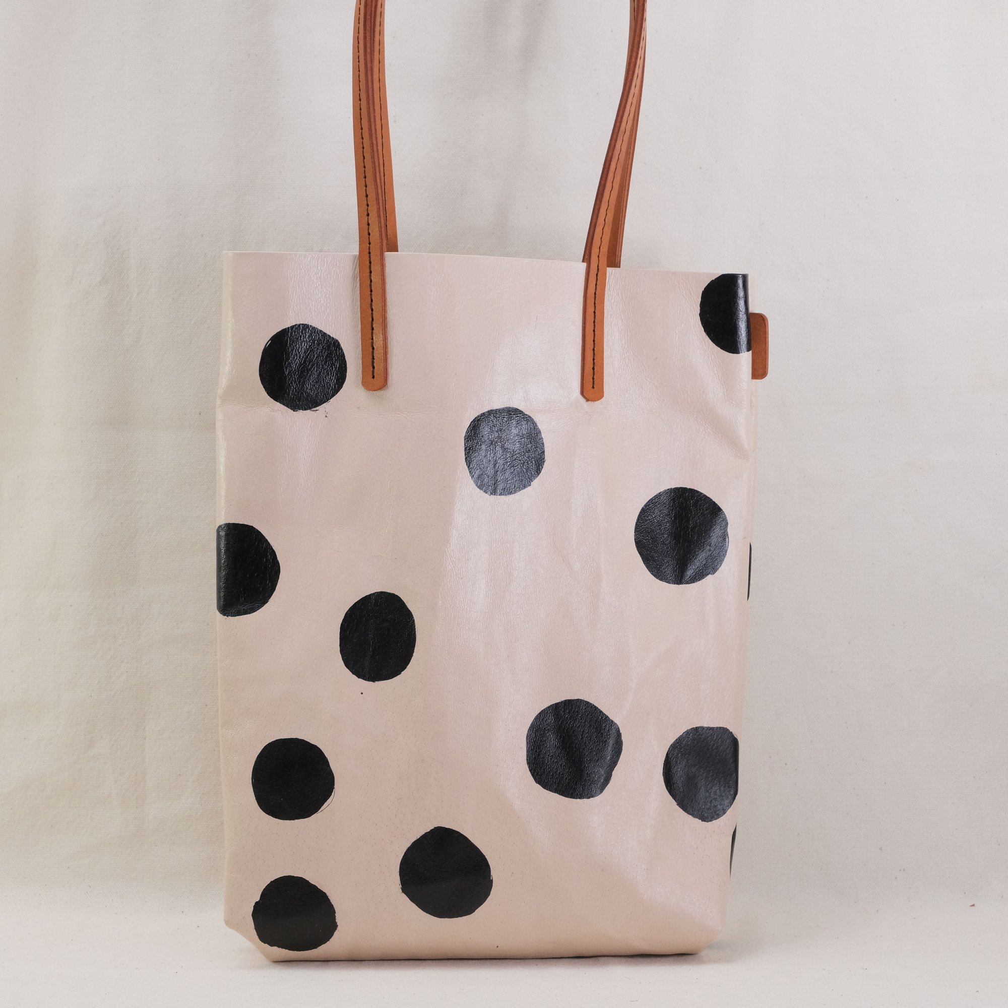 This Dots Series is a happy experiment on pigment and pattern. These are hand-printed on natural toned pigskin leather and then sealed. No two will ever be alike! How fun is that? It will eventually develop a patina with use.
