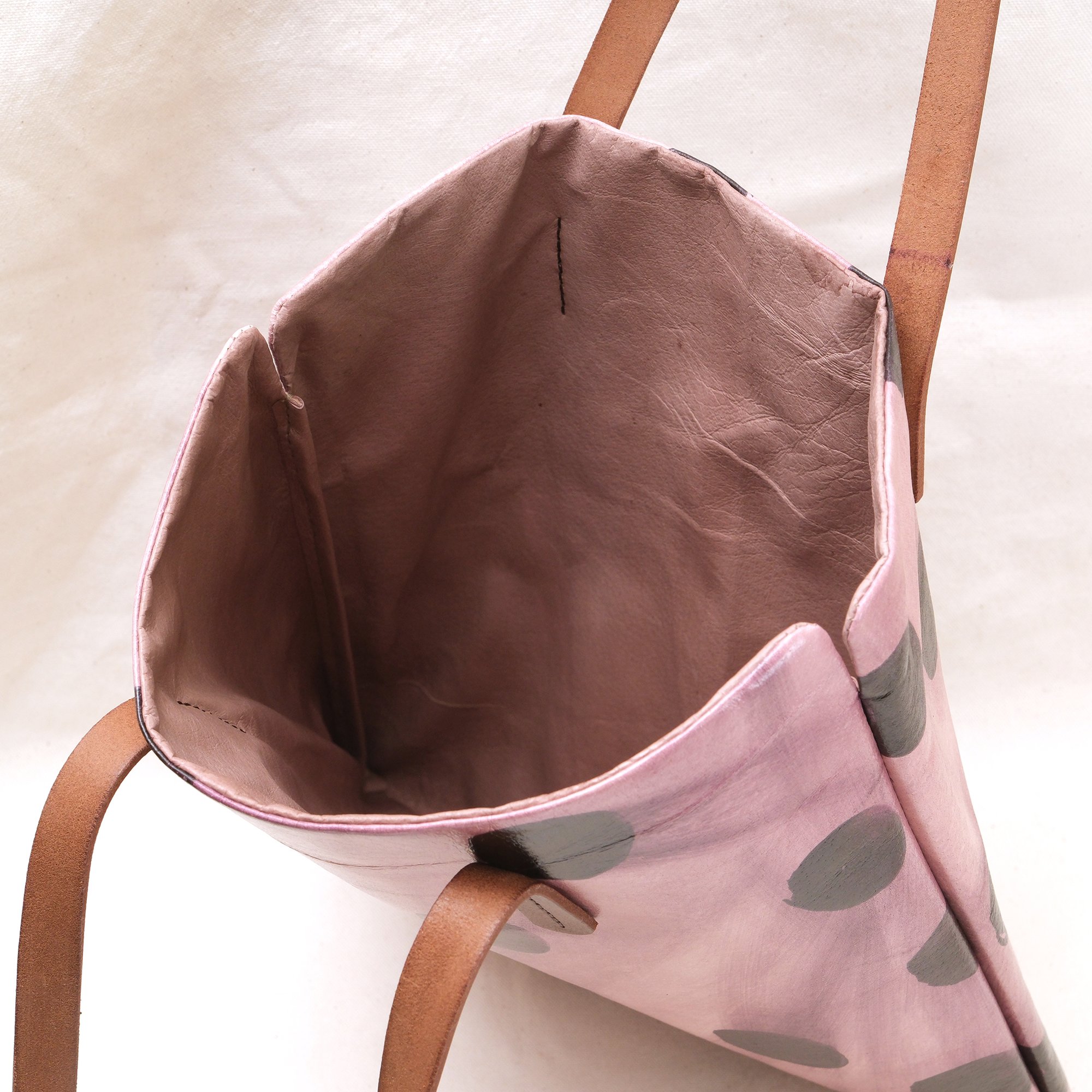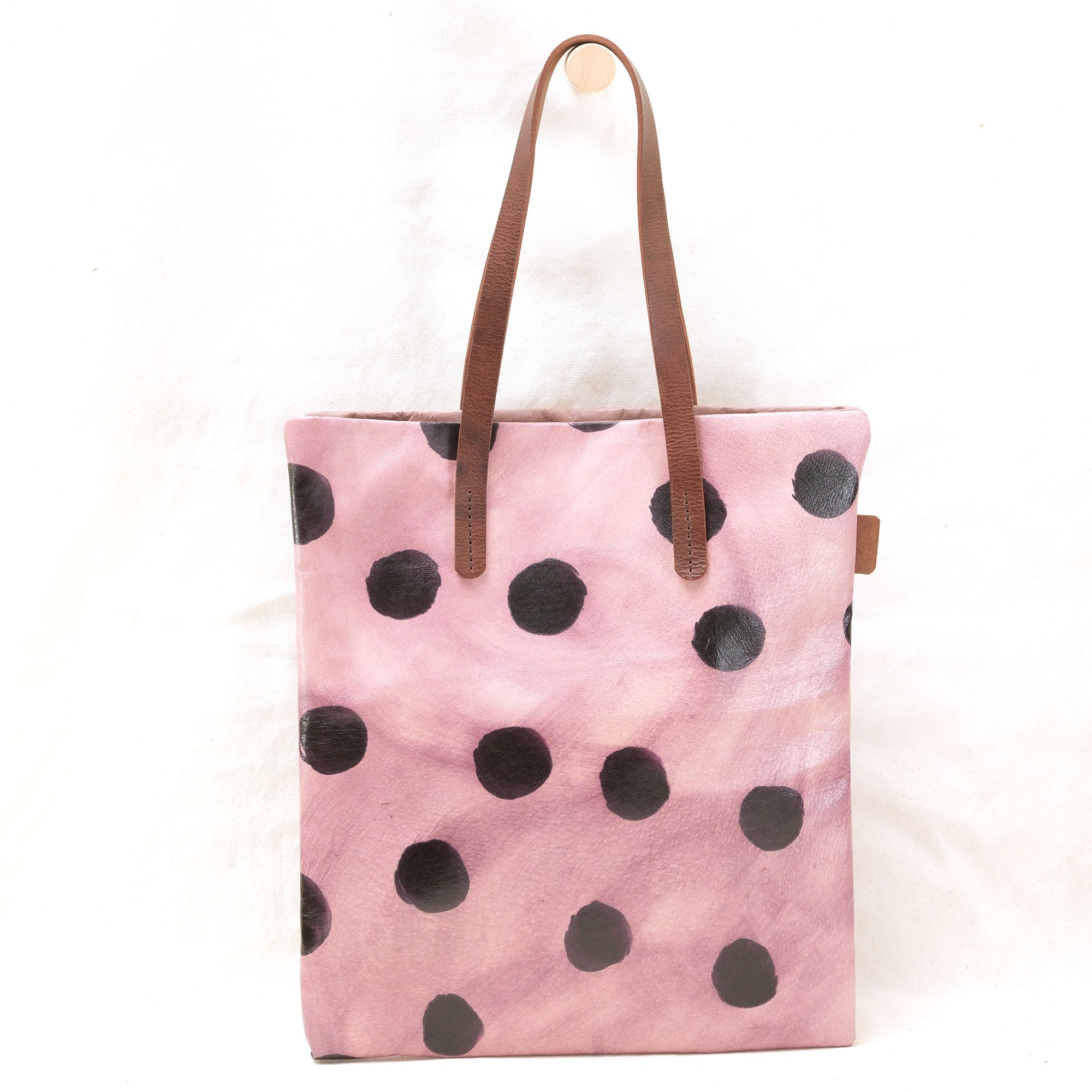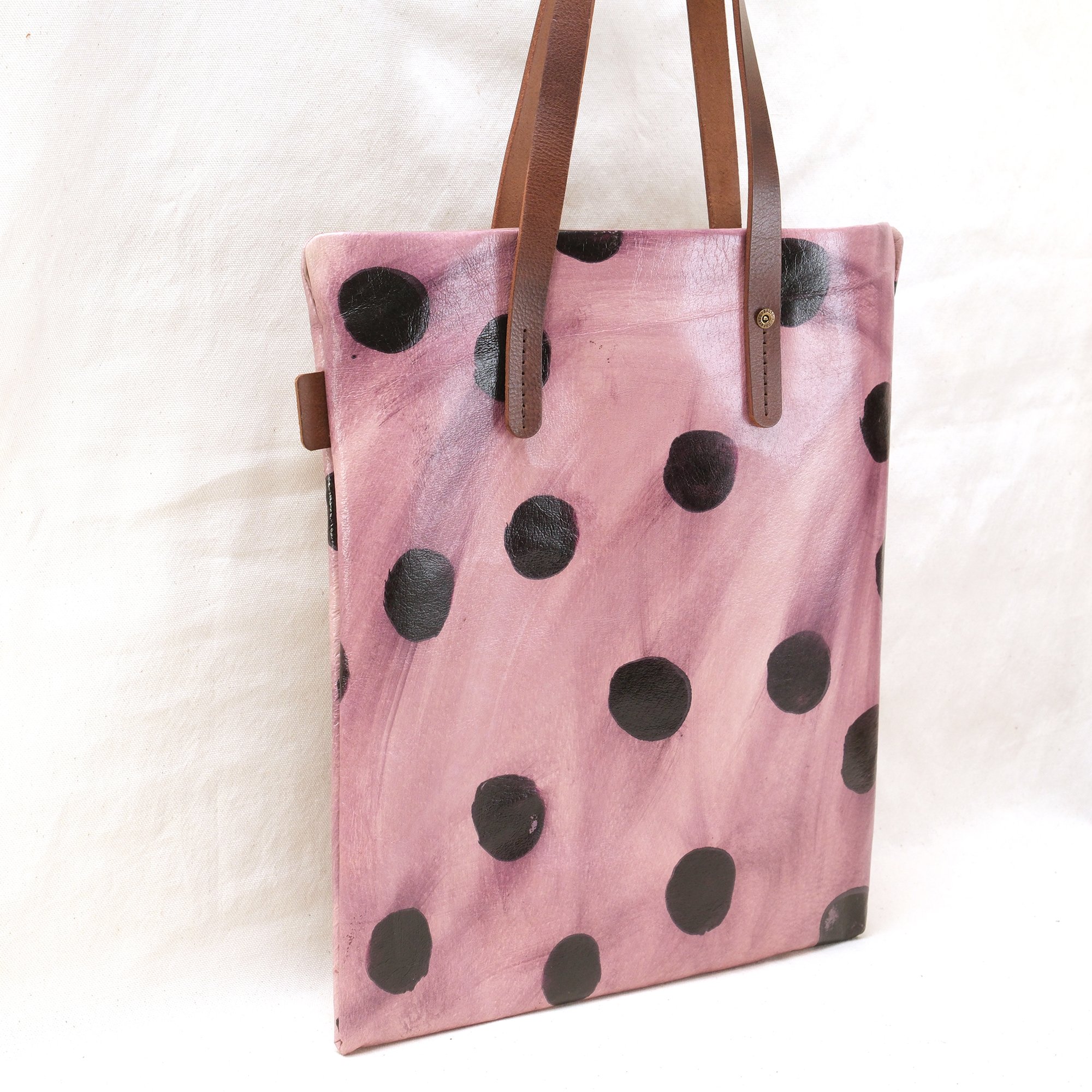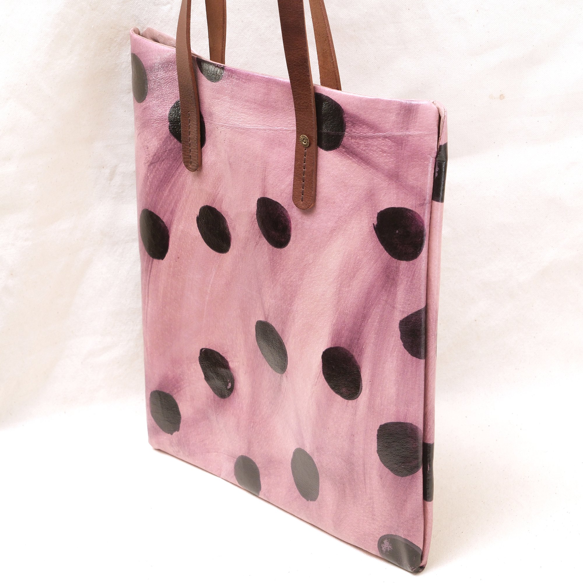 This Dots Series is a happy experiment on pigment and pattern. These are hand-printed on natural toned pigskin leather and then sealed. No two will ever be alike! How fun is that? It will eventually develop a patina with use.