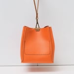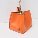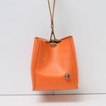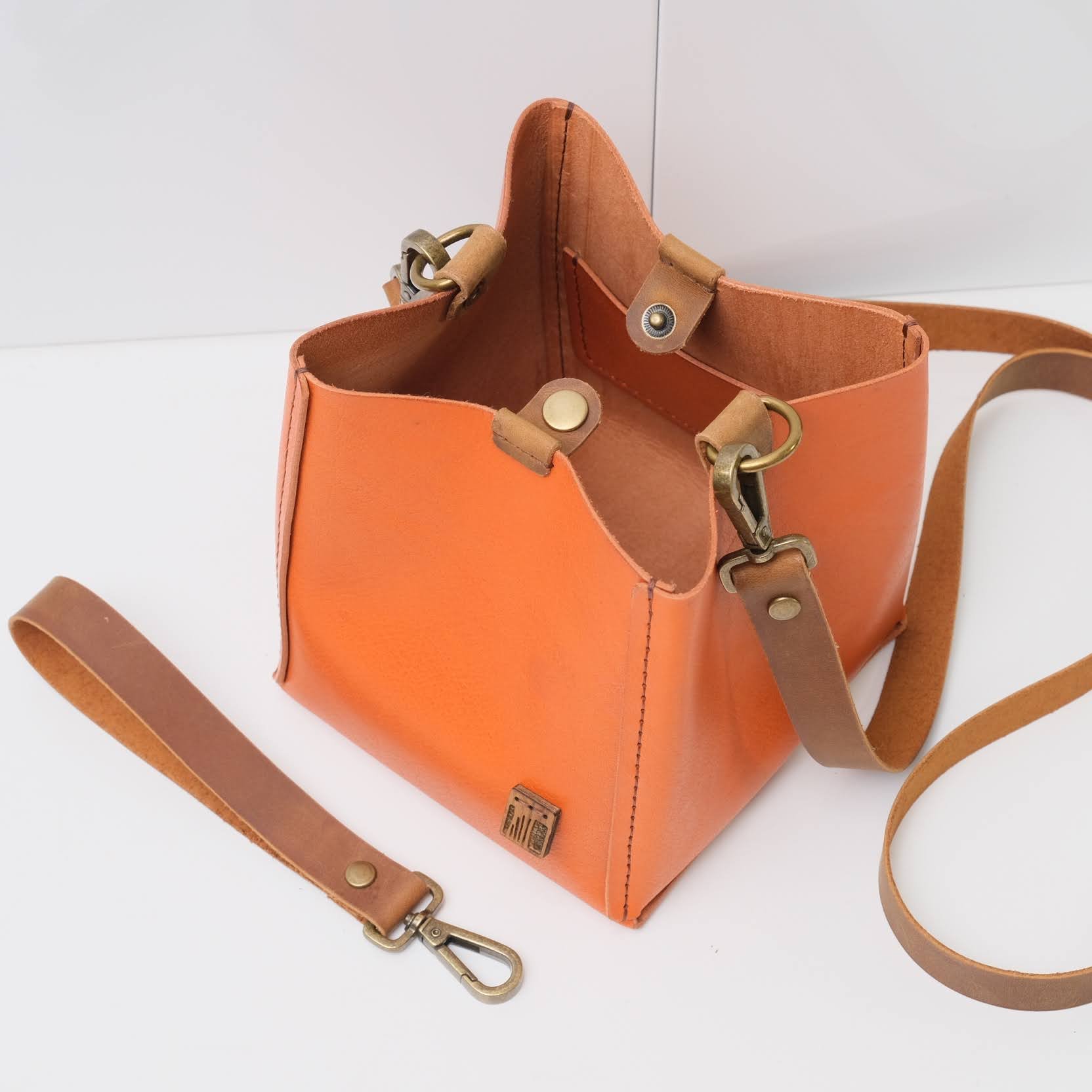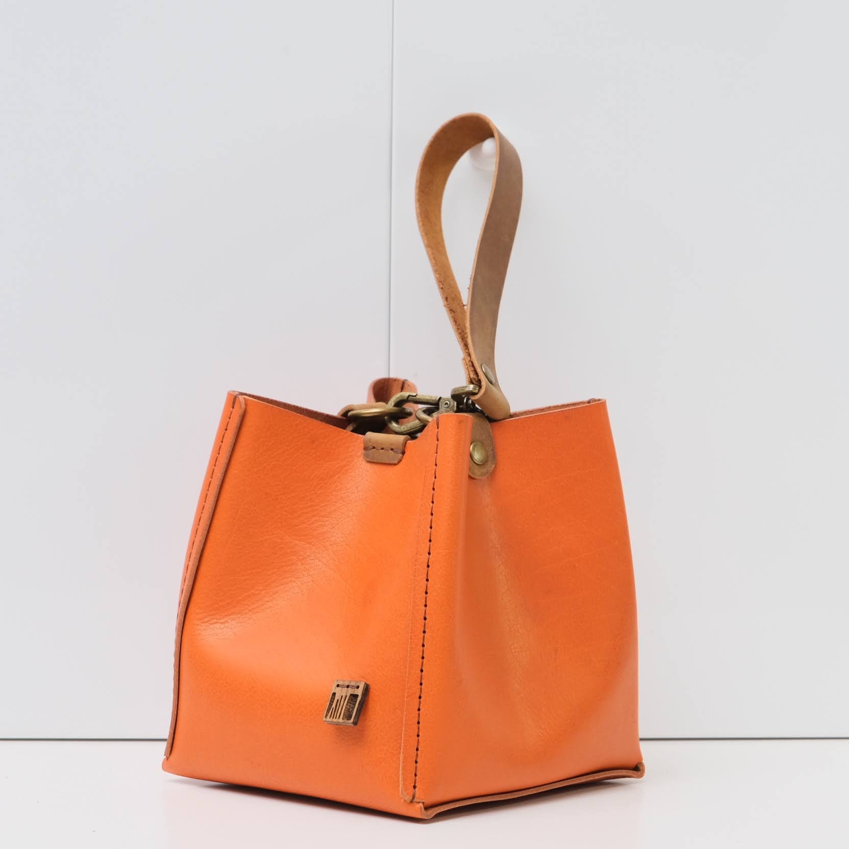 Made with vegetable-tanned leather in orange, this comes with both a shoulder sling and a wristlet in dark brown leather.