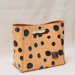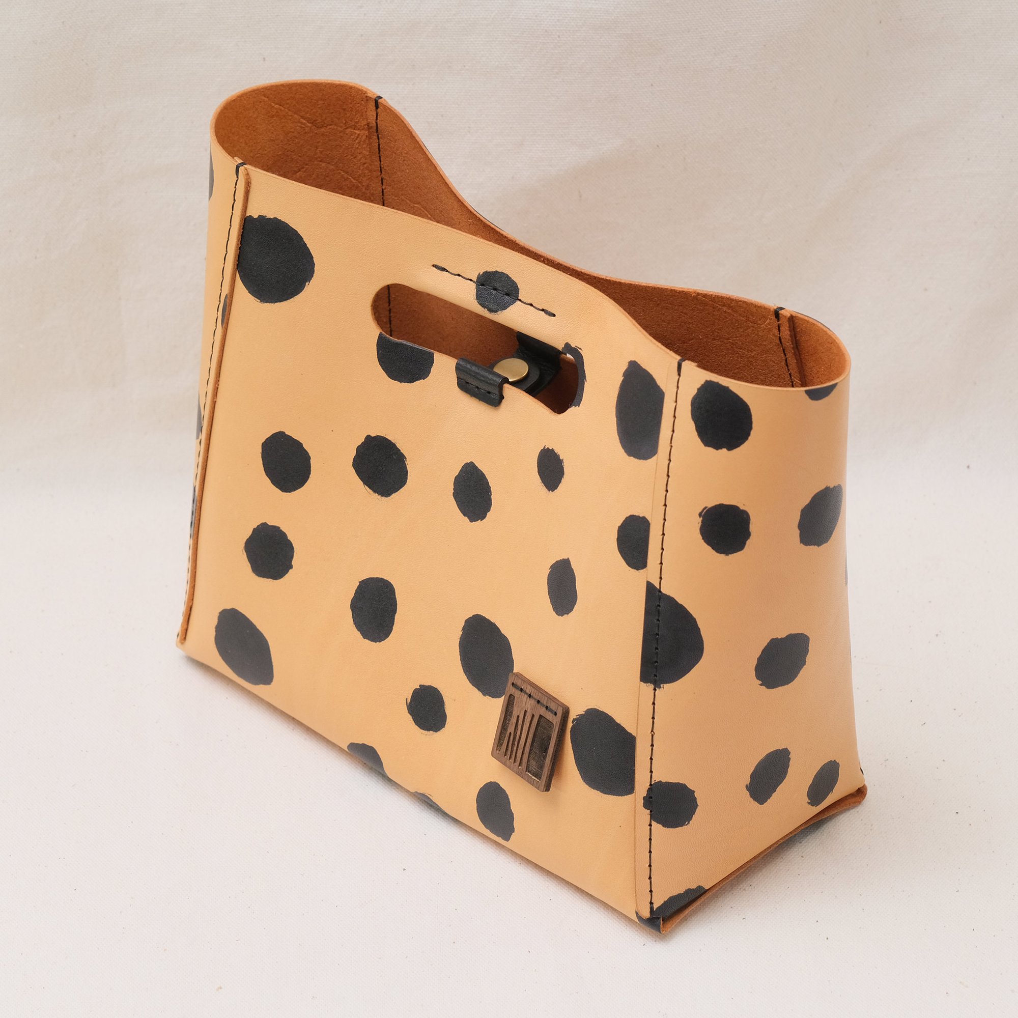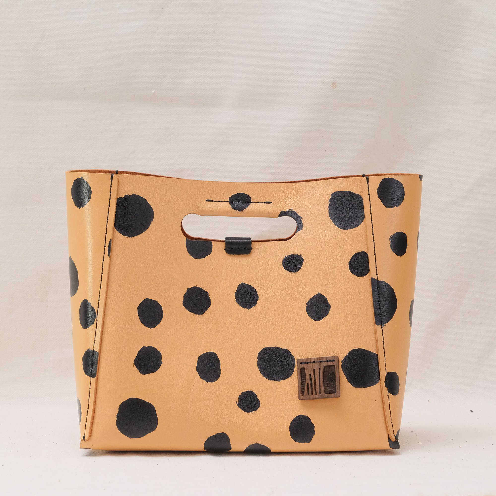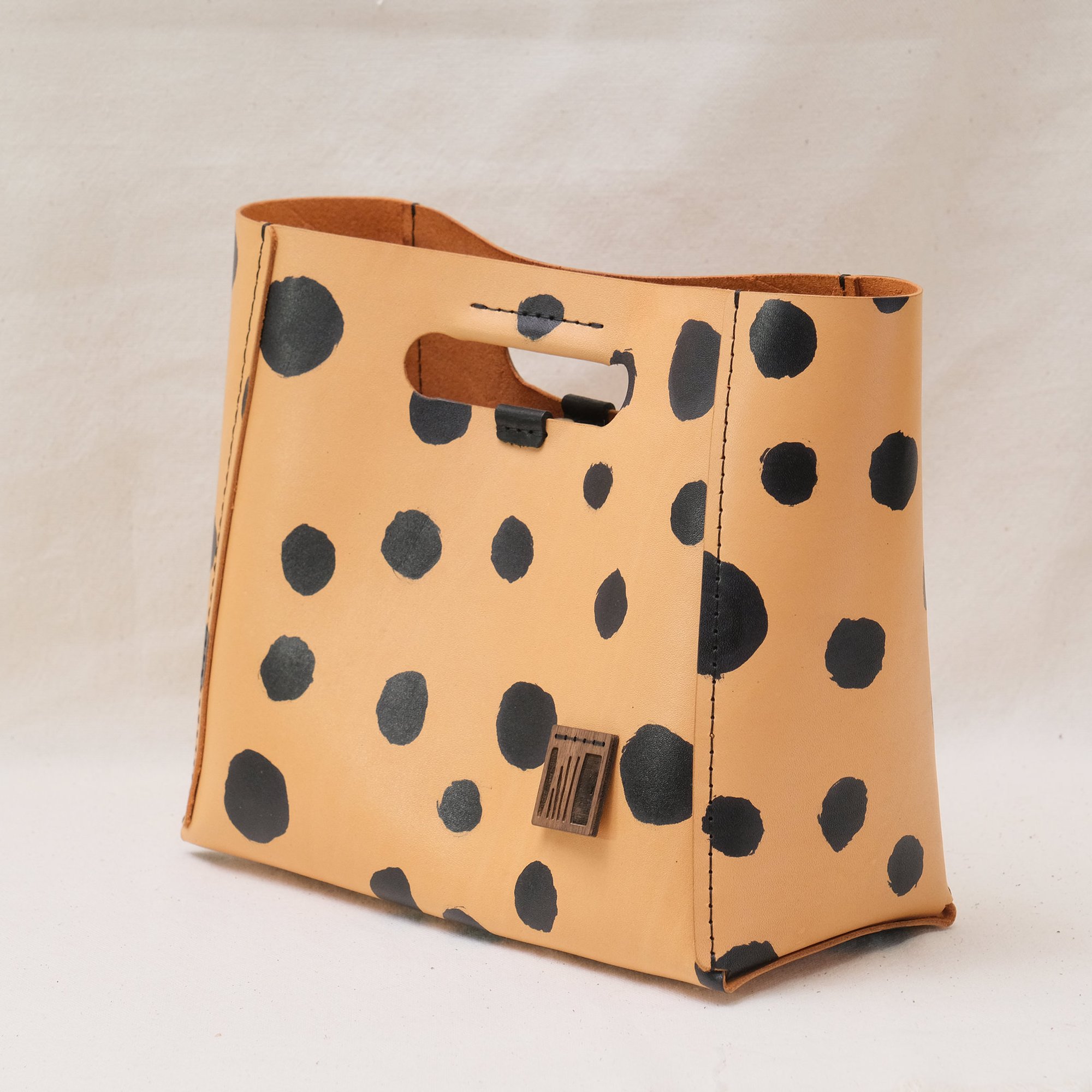 This Dots Series is a happy experiment on pigment and pattern. These are hand-printed on vegetable-tanned leather and then sealed. No two will ever be alike! How fun is that? It will eventually develop a patina with use.