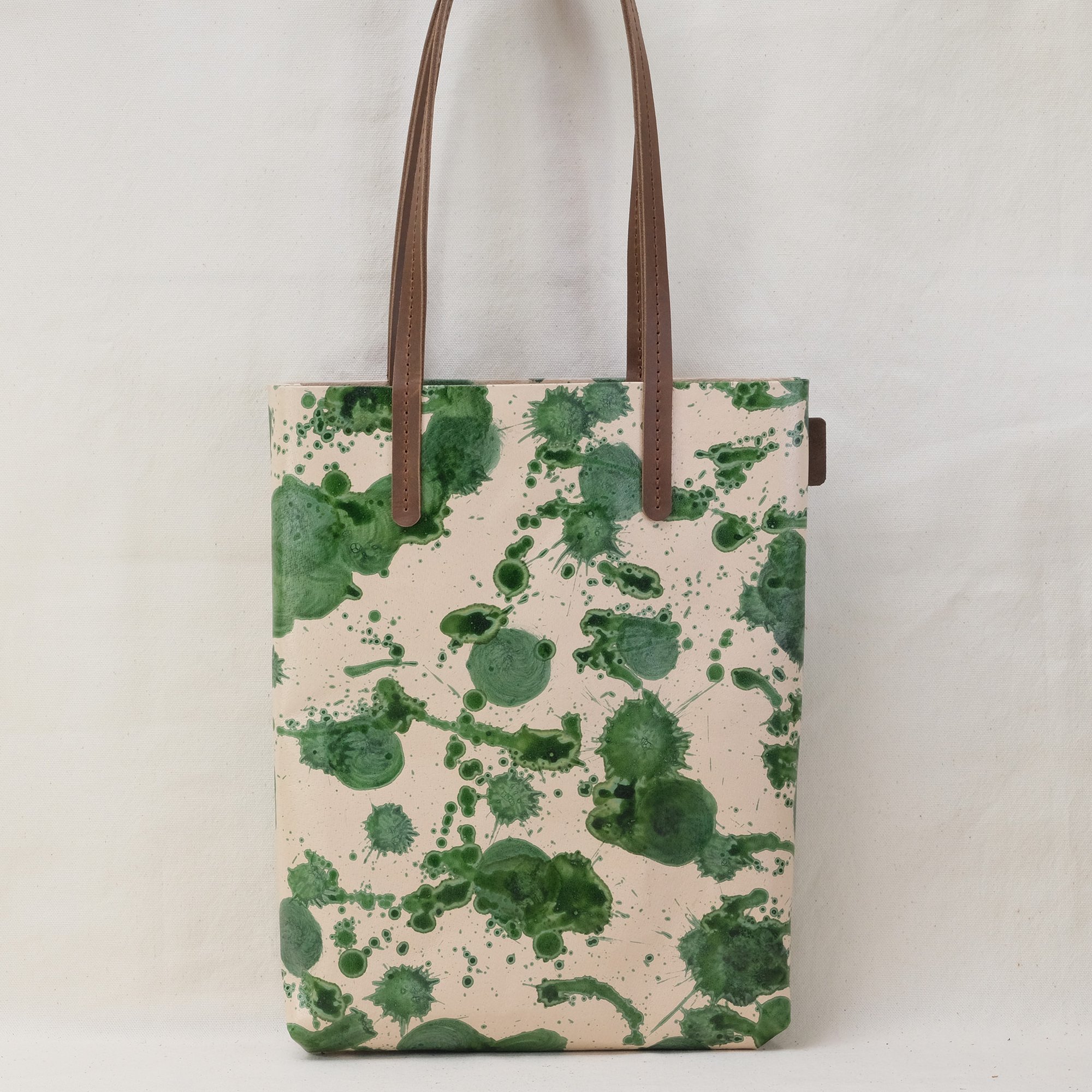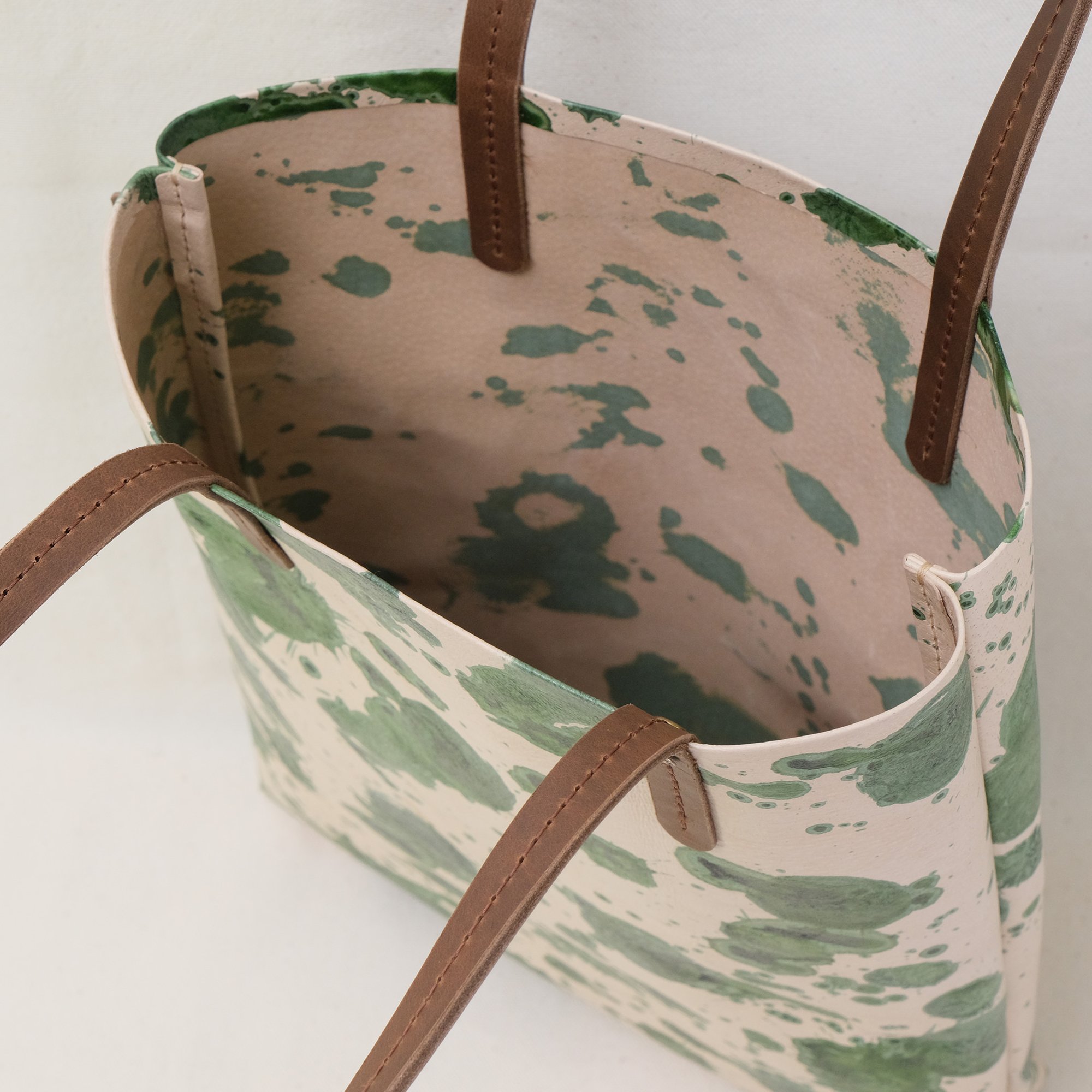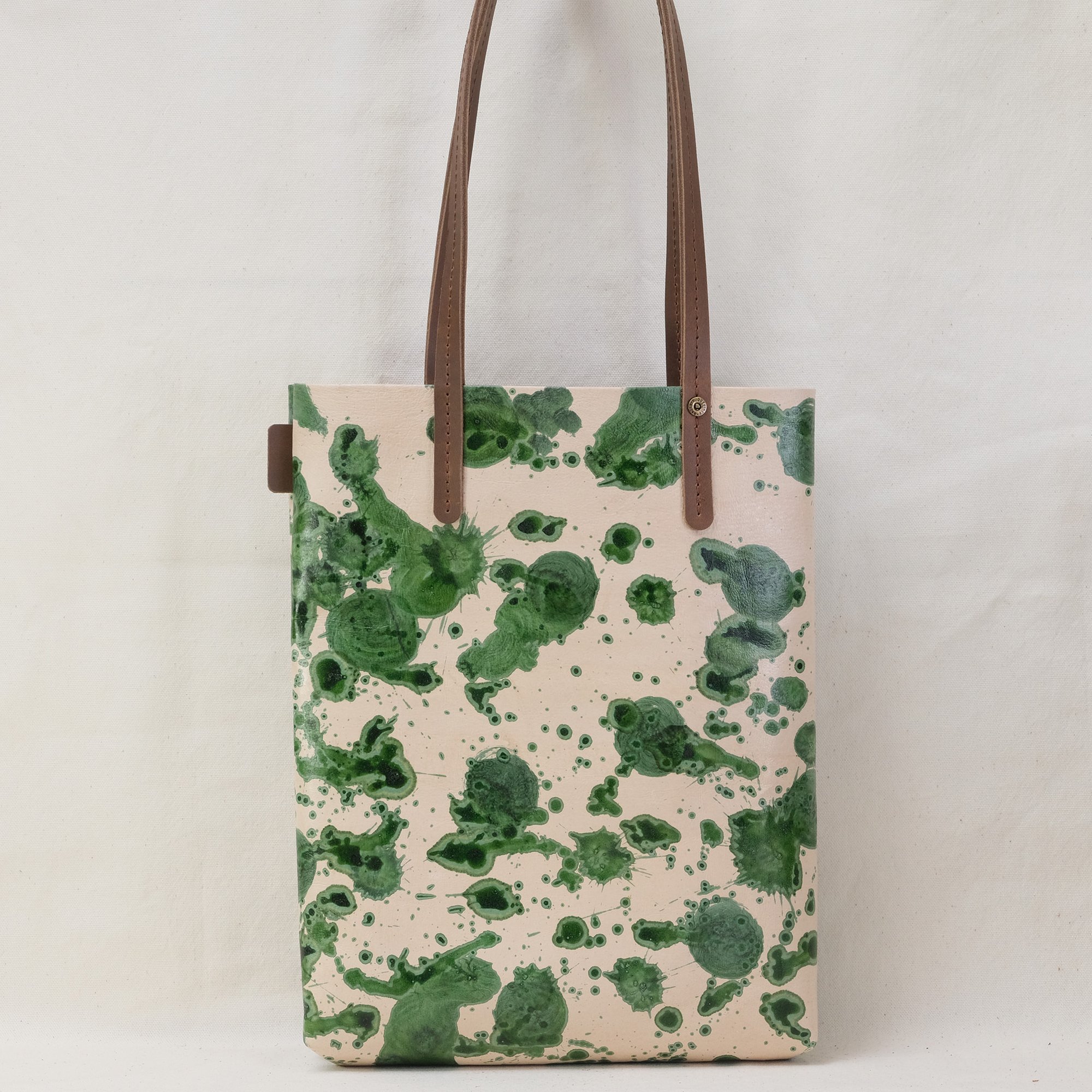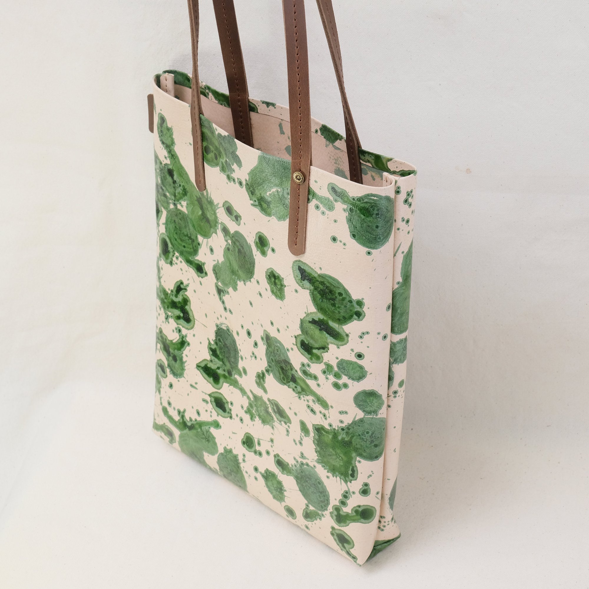 This Dots Series is a happy experiment on pigment and pattern. These are hand-printed on natural toned pigskin leather and then sealed. No two will ever be alike! How fun is that? It will eventually develop a patina with use.